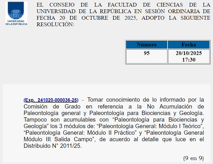 A partir del año lectivo 2026, entrará en vigencia la resolución N°95 del Consejo de Facultad, de fecha 20 de octubre de 2025, para los estudiantes de la Licenciatura en Ciencias Biológicas que cursen “Paleontología General” y/o “Paleontología para Biociencias y Geología”, y/o hayan cursado los 3 módulos de: “Paleontología General: Módulo I Teórico”, “Paleontología General: Módulo II Práctico” y “Paleontología General Módulo III Salida Campo”: