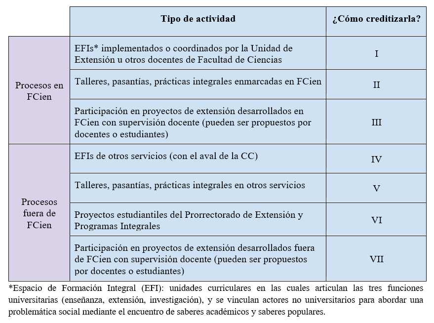 Existen diferentes formas de realizar actividades de extensión, que pueden ser propuestas de la Facultad de Ciencias o de otro servicio universitario. En caso de que la actividad no haya sido curricularizada anteriormente, se debe consultar a la Comisión de Carrera si la misma será aceptada para su Plan Curricular. A continuación se presenta una tabla que muestra los tipos de actividades que las y los estudiantes pueden realizar: